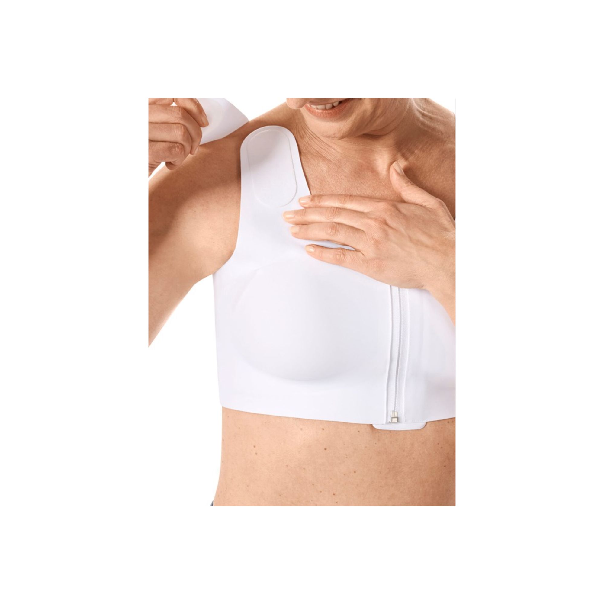 Sostén de compresión para soporte del drenaje linfático que permite aumentar la presión intersticial, ideal cuando el linfedema se ha desarrollado en la pared torácica y en el pecho. Cuenta con Tecnología SensElast® con unión 3D en espalda y lados y un patrón texturizado que, combinado con el movimiento del cuerpo, crea un suave efecto de masaje. Ideal para apoyar el flujo linfático y aflojar el tejido fibroso. Marca Amoena.