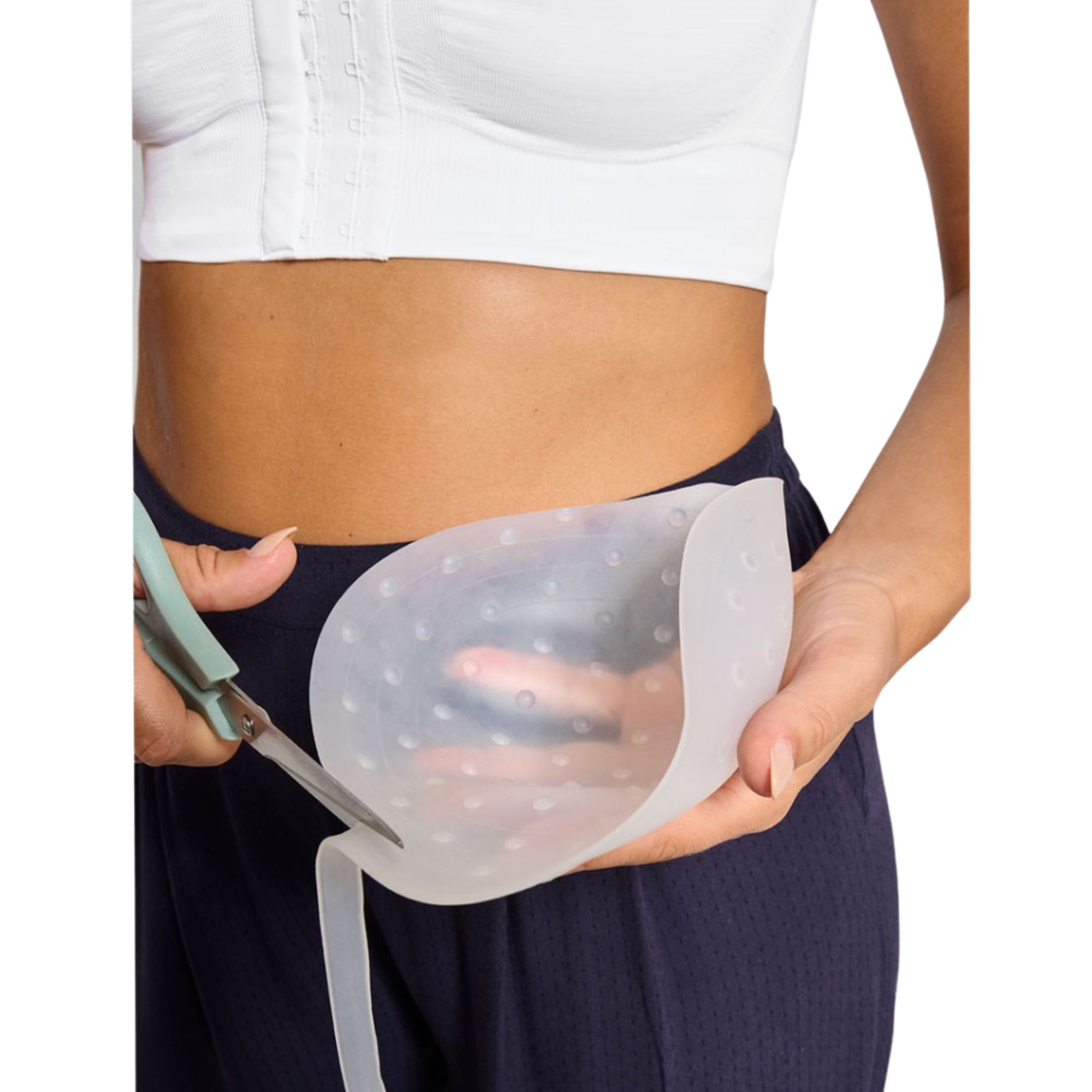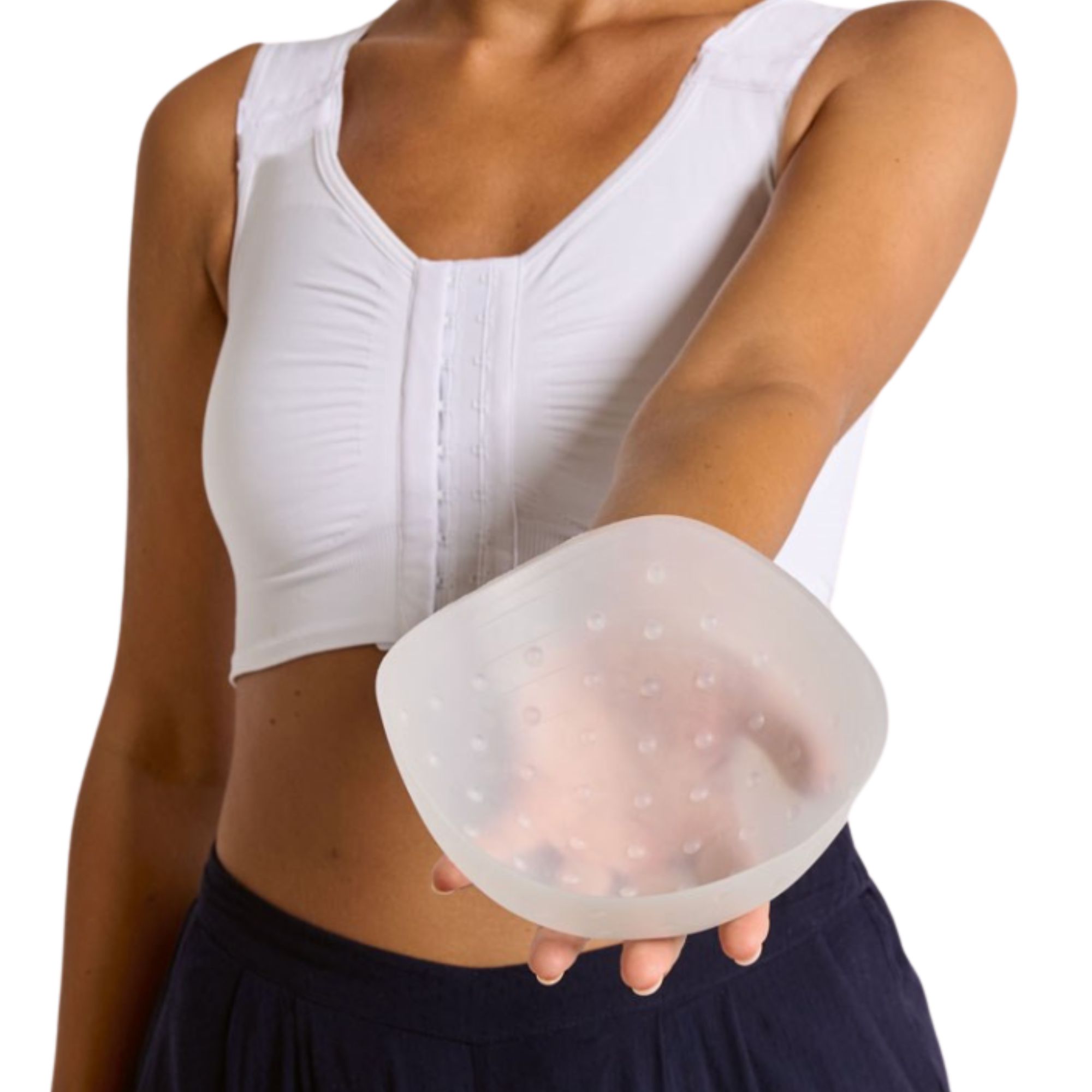 Almohadilla mamaria de silicona (100% silicona médica), para el apoyo durante la terapia de edema localizado en los senos. Cuenta con una superficie texturizada que proporciona un ligero efecto de masaje a través de pequeñas protuberancias en el interior de la almohadilla, lo que favorece el aflojamiento del tejido fibrótico. Es lavable y reutilizable, fácil de limpiar, para uso diario. Es de talla única (se puede cortar a medida individualmente). Marca Amoena.