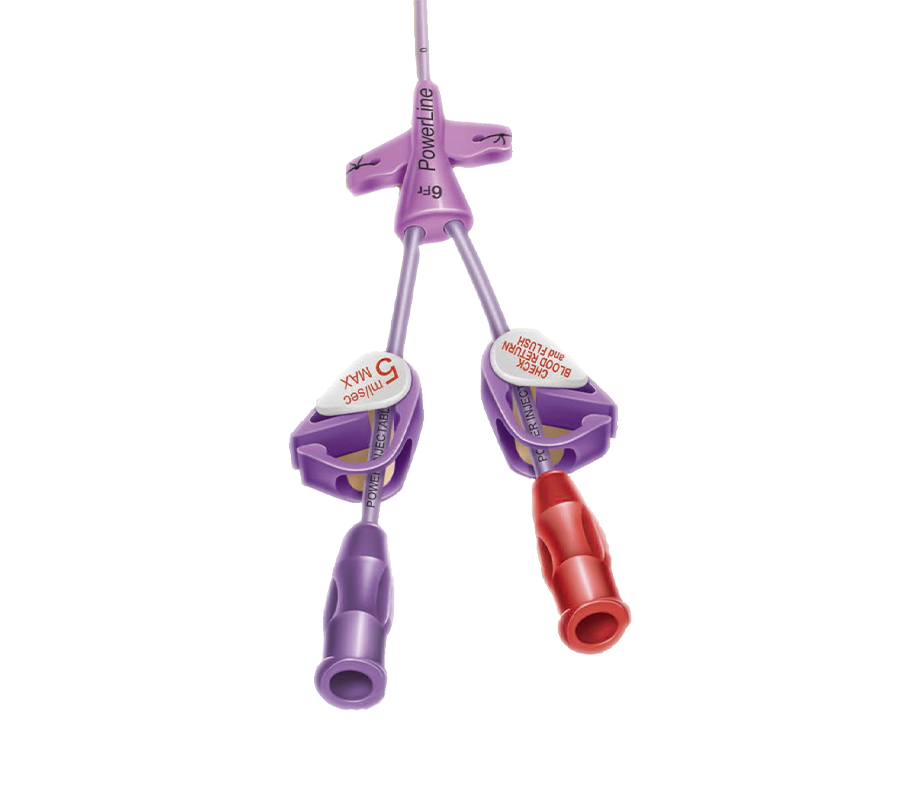 Catéter venoso central tunelizado de poliuretano radiopaco Powerline, resistente a torceduras con un diseño cónico inverso. Permite inyección de medios de contraste a altas presiones (3003 psi) hasta una velocidad de 5 ml/seg.Presenta marcas de profundidad y un cuff Surecuff situado por debajo del sitio de salida de la piel en el túnel subcutáneo, junto con adaptador hembra de bloqueo Luer y alas de sutura compatibles con el dispositivo Statlock para su fijación. Medida de 6 FR doble lumen con sistema de microintroductor. Marca BD.