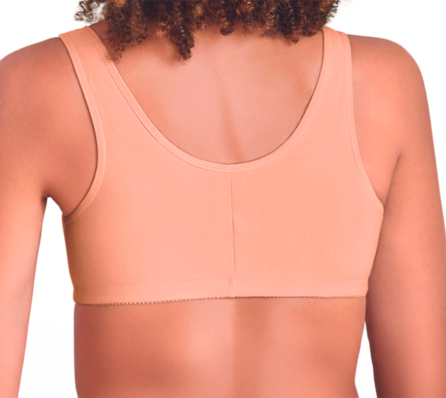 Sostén postquirúrgico no compresivo, sin costuras internas compuesto de algodón, con cierre frontal que permite un fácil acceso a las áreas de tratamiento. Marca Amoena.